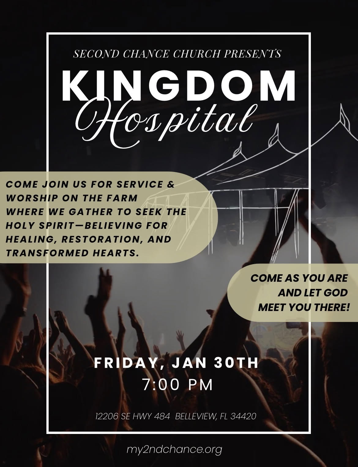 12206 SE Hwy 484, Belleview, Florida 12206 SE Hwy 484, Belleview, Florida, United StatesSecond Church Presents Kingdom Hospital. Come join us for service & workship on the farm where we gather to seek the Holy Spirit - believing for healing, restoration and transformed hearts. Come as you are and let God meet You there!